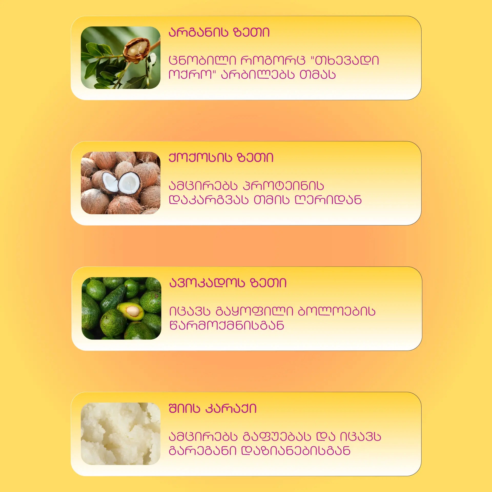 ზეთები და ბოტანიკური ექსტრაქტები ღრმად კვებავს თმის ღერს და იცავს მომავალში ტენიანობის დაკარგვისგან
